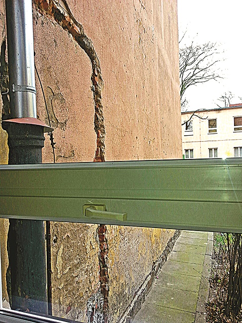 Widok na boisko asfaltowe z okna korytarza szkolnego. Ubytki tynku w murze i wykuta bruzda, prawdopodobnie pod jakąś instalację, są tu od dawna