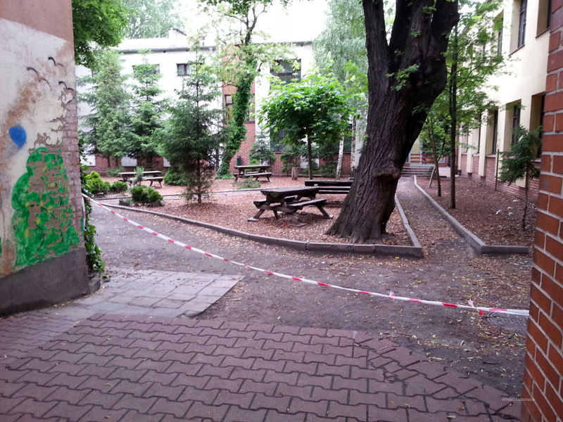 Plastikowa biało-czerwona taśma zagradzająca wejście na boisko. Wisiała tam od poprzedniego festynu z okazji „Drzwi Otwartych”. Zdążyła już wyblaknąć ze starości. Ławki i stoły ogrodowe postawiono chyba dla szpanu? Aż tak wysokie krawężniki nie są potrzebne.