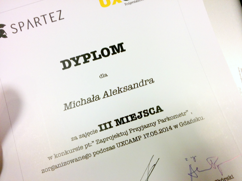 Michał Aleksander zajął III miejsce w konkursie „Zaprojektuj Przyjazny Parkometr” zorganizowanym podczas UXCAMP 17 maja br. w Gdańsku