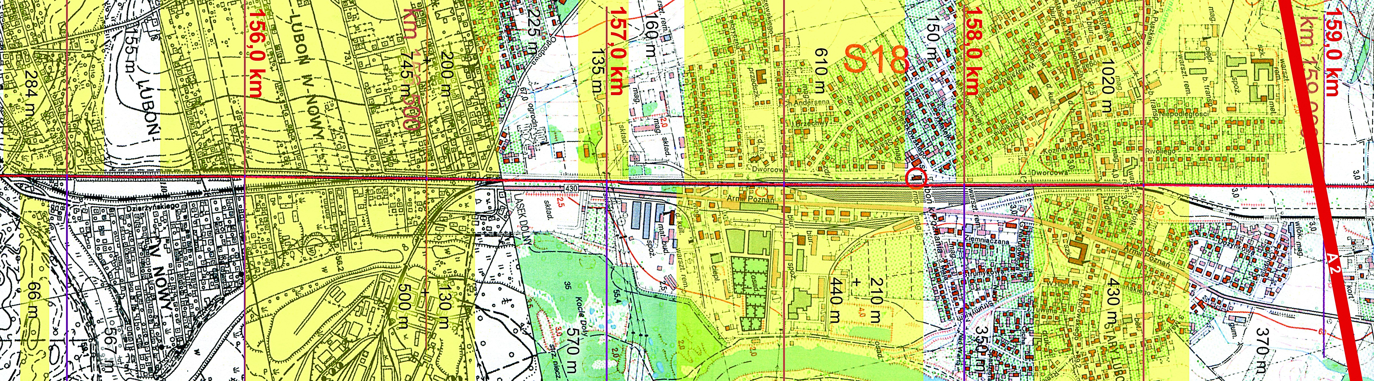 Mapka z zaznaczonym poziomo torem kolejowym Poznań-Wrocław (czerwony) oraz naniesionymi obszarami (żółte), na wysokości których zostaną zamontowane ekrany akustyczne. Czerwonym okręgiem zaznaczono dworzec w Luboniu oprac. Piotr P. Ruszkowski