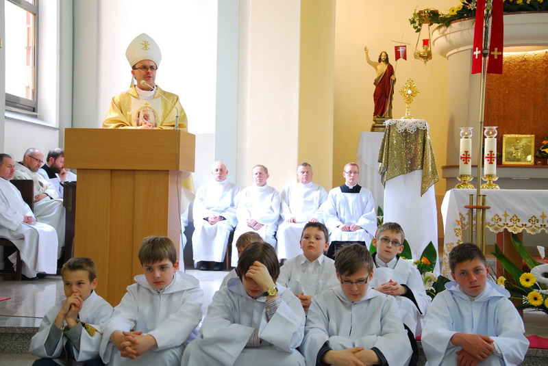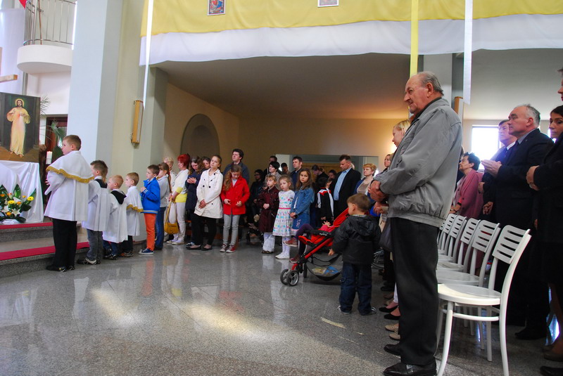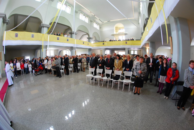 Na początku uświetniający swoim występem uroczystość chór męski Kompania Druha Stuligrosza pod batutą Andrzeja Niedziałkowskiego zaśpiewał „Gaude Mater Polonia” (wśród wykonawców był lubonianin Rajmund Krusinski). Duchowieństwo weszło do kościoła w uroczystej procesji. Ks. proboszcz Paweł Dąbrowski zaznaczył, iż bp Damian Bryl jest pierwszym hierarchą kościelnym przebywającym oficjalnie w młodej, lubońskiej parafii. Powitał gości, którymi byli: prezes Stowarzyszenia „Solidarni w Prawdzie i Miłosierdziu” – Jolanta Korcz, założyciel tego stowarzyszenia – Edmund Kostrzewski, poseł na Sejm RP – Tadeusz Dziuba, burmistrz Dariusz Szmyt, wiceburmistrzowie: Mikołaj Tomaszyk, Rafał Marek, przewodniczący Rady Miasta Luboń – Marek Samulczyk, radni miejscy i powiatowi.