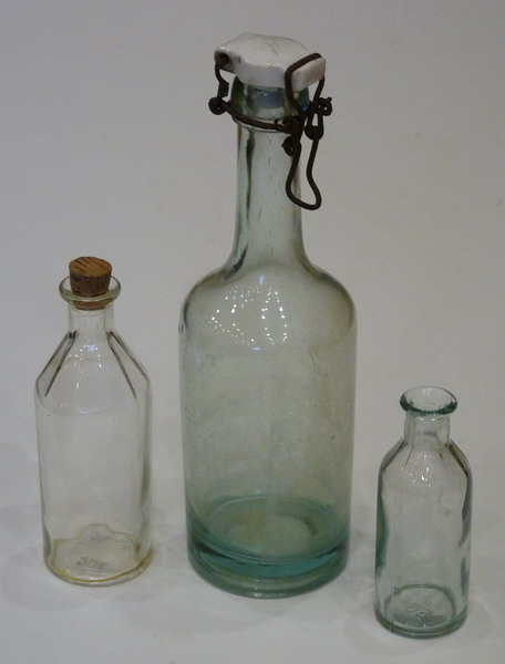 Inne dwa naczynia szklane znalezione na kościelnej wieży to buteleczki o pojemności 50 i 100 ml zamykane korkiem naturalnym. W odróżnieniu od butelki z porcelanką, tutaj na ściankach są widoczne pionowe ślady, które świadczą o tym, że butelki te były wytwarzane maszynowo przy użyciu dwuczęściowej formy. Naczynia te prawdopodobnie były wykorzystywane niegdyś do przechowywania leków wykonywanych bezpośrednio w aptece.