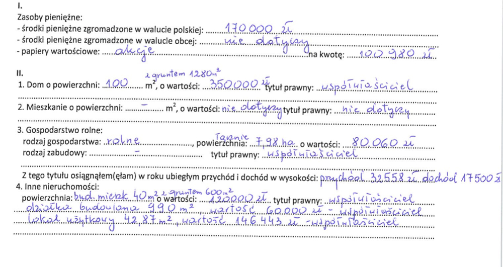 – nie wykazano działki, na której posadowiony jest dom lub udziału w gruncie, na którym posadowiono budynek lub mieści się posiadany lokal: Rafał Mania, Elżbieta Zapłata-Szwedziak;