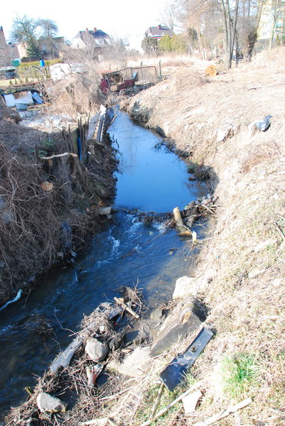 Widok Strumienia Junikowskiego na jego zakręcie (prawie pod kątem prostym) przy ul. Hibnera. Tędy wzdłuż cieku powinna powstać ścieżka rowerowa fot. Piotr P. Ruszkowski