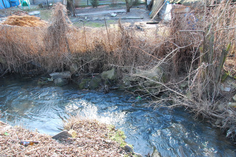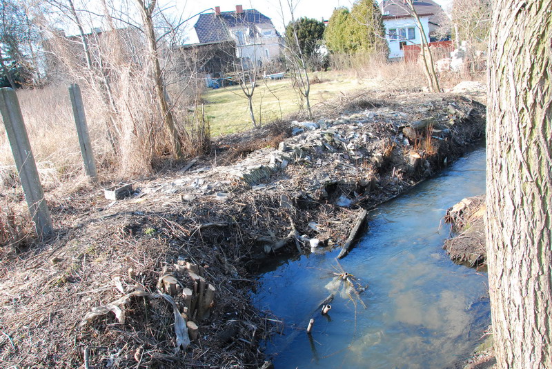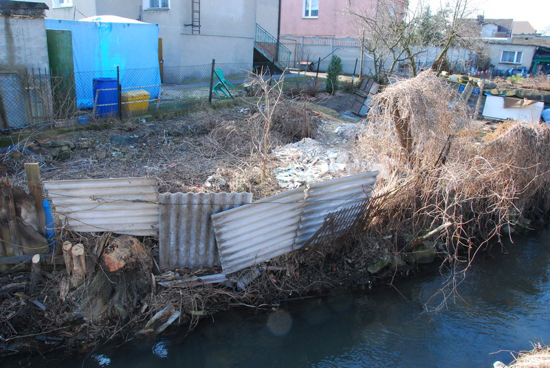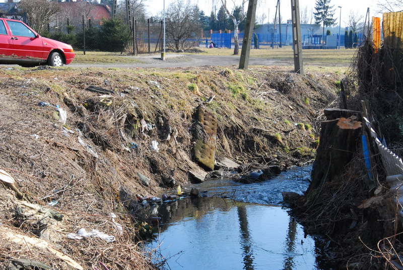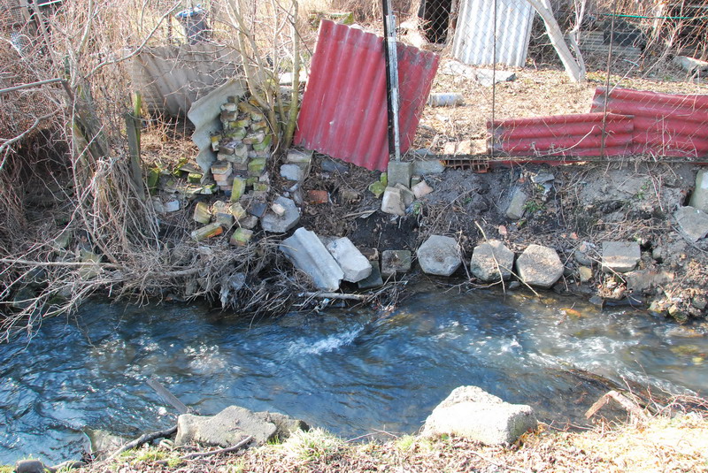 Wycięcie chaszczy ujawniło dopiero, z czego zbudowane są obecnie skarpy Strumienia Junikowskiego. Ogólnie można powiedzieć, że widać śmieci niebiodegradowalne: gruz różnego pochodzenia od cegieł, dachówek i innych po płyty chodnikowe, popiół, butelki, złom, opony, meble itp. Najbardziej przerażającym jest powszechna obecność płyt eternitowych, które czasami stanowią pionowe zapory dla gromadzenia w bezpośrednim sąsiedztwie wody śmieci. Zapewne częściowo naturalne, ale i poprzez dokładanie różnych rzeczy do skarp przebieg trasy strumienia w tym miejscu jest wyjątkowo zawiły. Zgodnie z prawem, do wszystkich cieków, wzdłuż ich przebiegu, z obydwu stron powinien być zagwarantowany swobodny dostęp. Czy po przeprowadzanej obecnie regulacji powstaną w stosownej odległości płoty odgradzające posesje od cieku?
