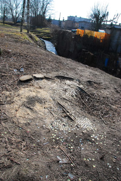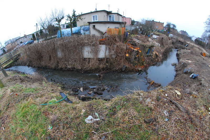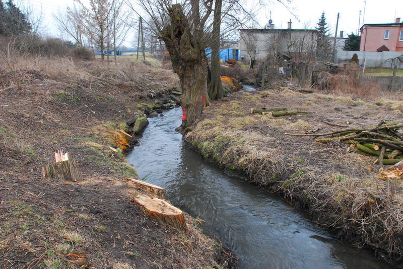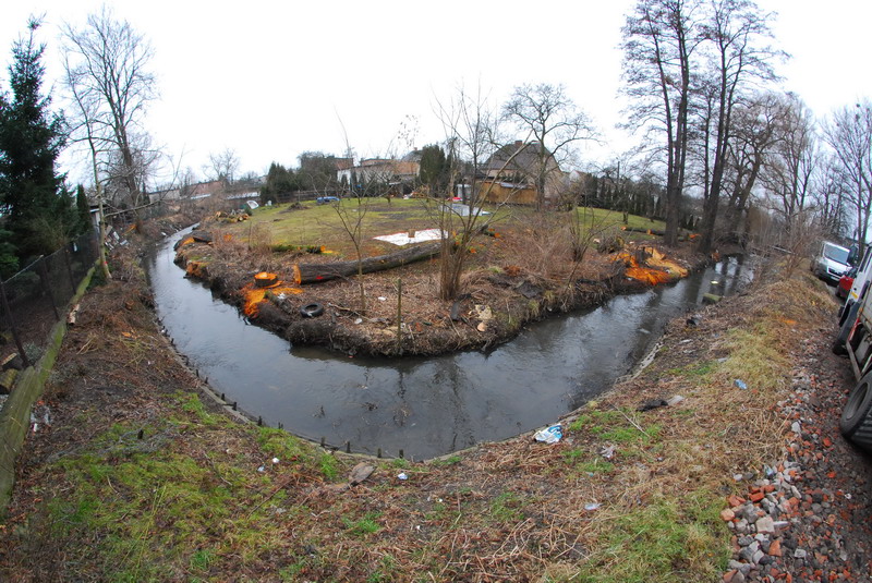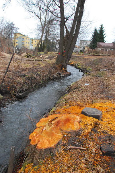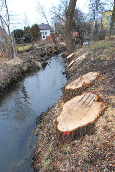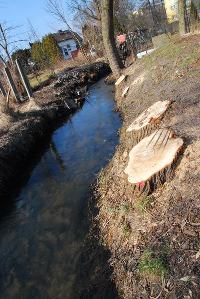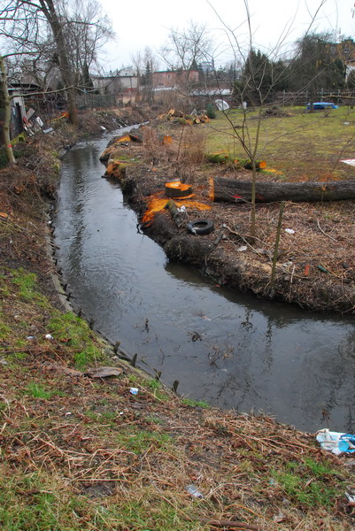 Po wycięciu krzewów i drzew ujawnia się stan skarp. Widok przy ul. Tuwima, z lewej nad ciekiem widać mostek, którym ścieżka rowerowa przejdzie na drugą stronę wzdłuż cieku przy ul. Strumykowej fot. Piotr P. Ruszkowski