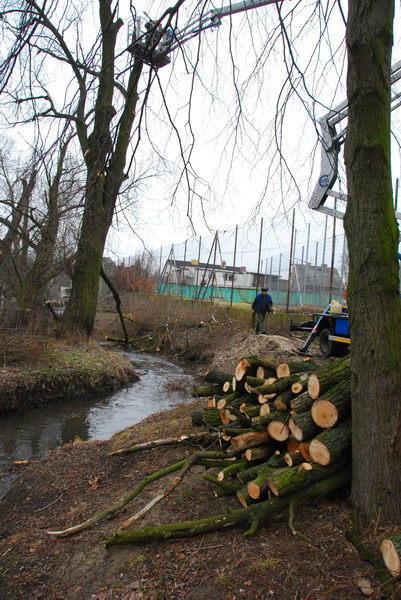 Przystąpiono do regulacji chyba najbardziej zaniedbanej części Strumienia Junikowskiego, na odcinku od ul. Armii Poznań do wysokości ul. Spadzistej i Tuwima. Obecnie specjalistyczne ekipy prowadzą wycinkę drzew i krzewów przeważnie dziko rosnących wzdłuż cieku. W związku z bliskością domów czy płotów, których posesje sięgają nurtu, dostęp jest utrudniony. Nie można powalać drzew jednym cięciem od dołu. Tam gdzie można dojechać ciężkim samochodem z wysokim koszem (rejon ul. Hibnera, końcówka ul. Tuwima), tam, od góry, łańcuchowymi piłami spalinowymi odcina się fragmenty konarów wybujałych drzew. W niedostępnych miejscach stosuje się niewygodną technikę pionowych wyciągów linowych, na których zawieszony „drwal” kawałkami obcina drzewo.