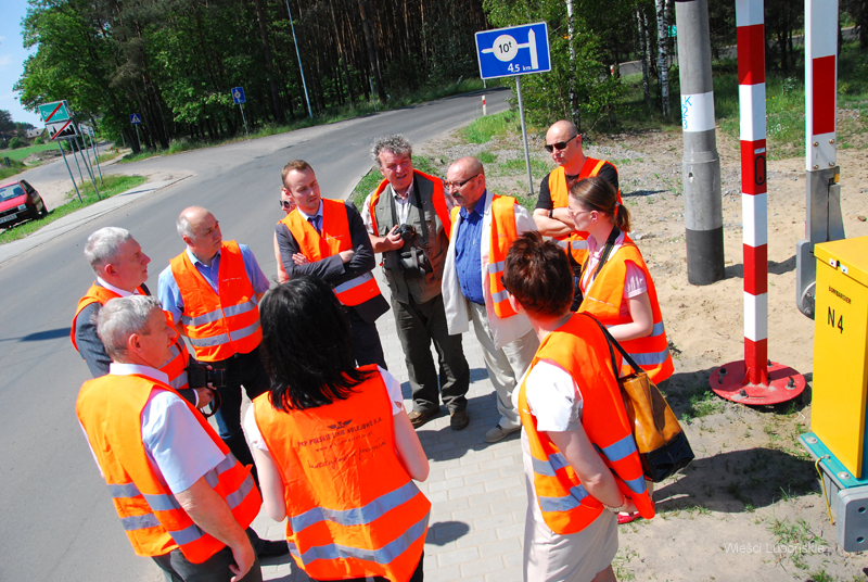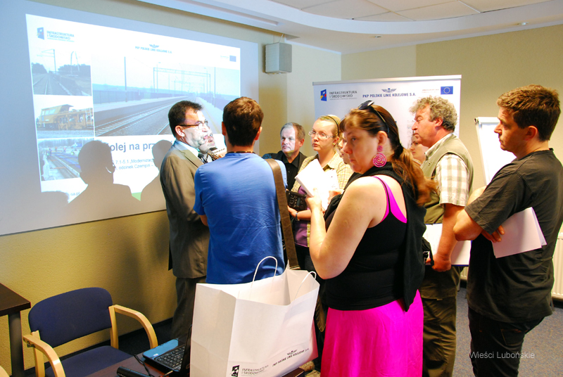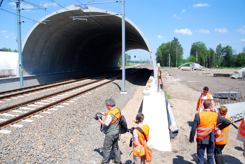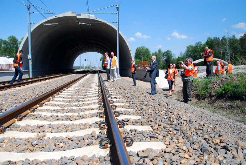 Podczas autobusowego objazdu inwestycji, zainteresowanym dziennikarzom pokazano m.in. w okolicy Drużyny Poznańskiej budowę za około 10 mln zł ekoduktu, czyli bezkolizyjnego przejścia dla zwierząt, pod którym, po zasypaniu ziemią w tunelach jeździć będą pociągi i przebiegać będzie droga. Na pierwszym planie przy torach polskie czujniki „Bombardier” automatycznego systemu sterowania sygnalizacją i szlabanami w oddalonym ok. 3 km przejeździe kolejowym fot. Piotr P. Ruszkowski