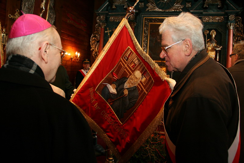 Po Mszy św. ks. abp S. Gądecki zainteresował się genezą powstania sztandaru Stowarzyszenia „Forum Lubońskie” z wizerunkiem hrabiego Augusta, wykonanego przez poznańską Pracownię Haftu Artystycznego Małgorzaty Grzelak   fot. Włodzimierz Buczyński