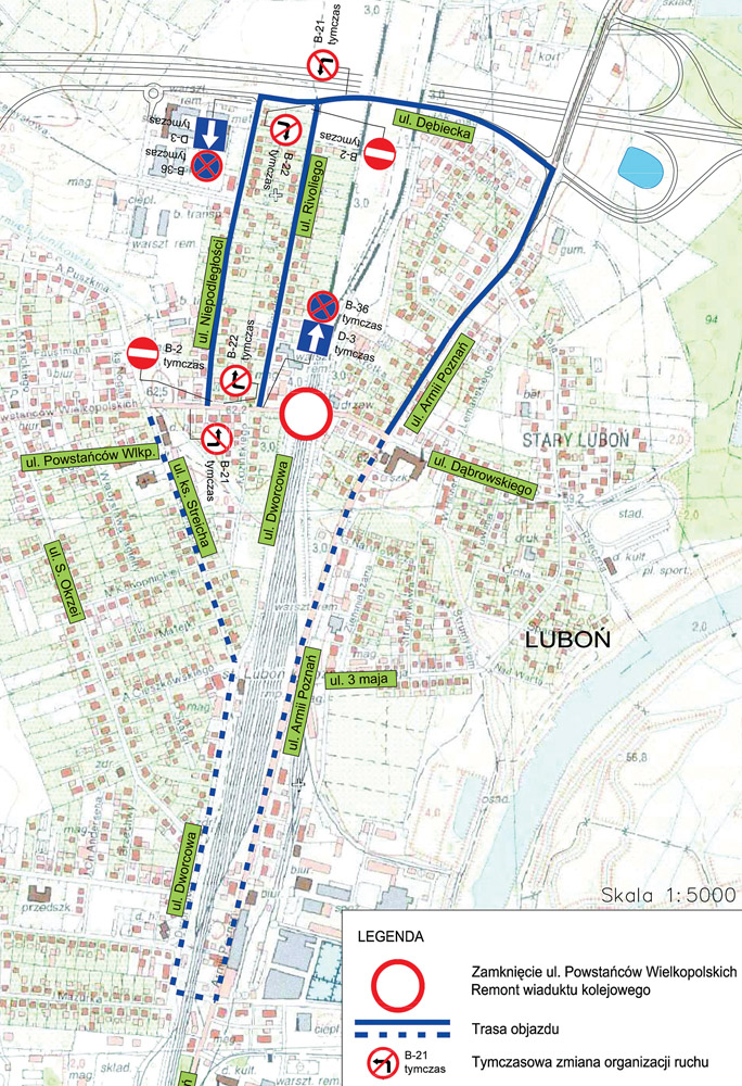 Trasa objazdów w związku z modernizacją wiaduktu kolejowego w ul. Powstańców Wlkp. Zalecany objazd (linia niebieska ciągła) prowadzi ulicami Armii Poznań, Dębiecką – tunelem przyautostradowym, wjazd do Lubonia ulicą Niepodległości, wyjazd ulicą Rivoliego (obie będą na czas remontu jednokierunkowe z zakazem zatrzymywania!). Drugi możliwy objazd (linia niebieska przerywana) prowadzi ul. Armii Poznań, przejazdem kolejowym przy Zakładach Ziemniaczanych, dalej Dworcową i ks. Streicha