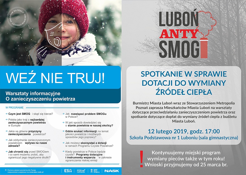 Pod tym hasłem Burmistrz Miasta Luboń oraz Stowarzyszenie Metropolia, w ramach Kampanii Luboń Anty Smog organizują spotkanie dla mieszkańców, które się odbędzie we wtorek, 12 lutego o godz. 17, w Szkole Podstawowej nr 1, przy ul. Poniatowskiego 16. Spotkanie w formie warsztatów będzie dotyczyło zanieczyszczenia powietrza oraz walki ze smogiem. Zostaną na nim poruszone m.in. zagadnienia: